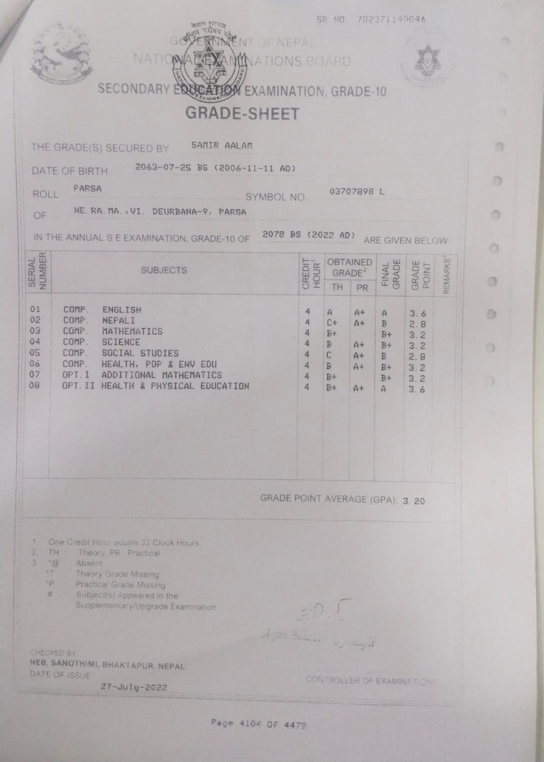| Exam | Full Marks | Pass Marks | Marks Obtained |
