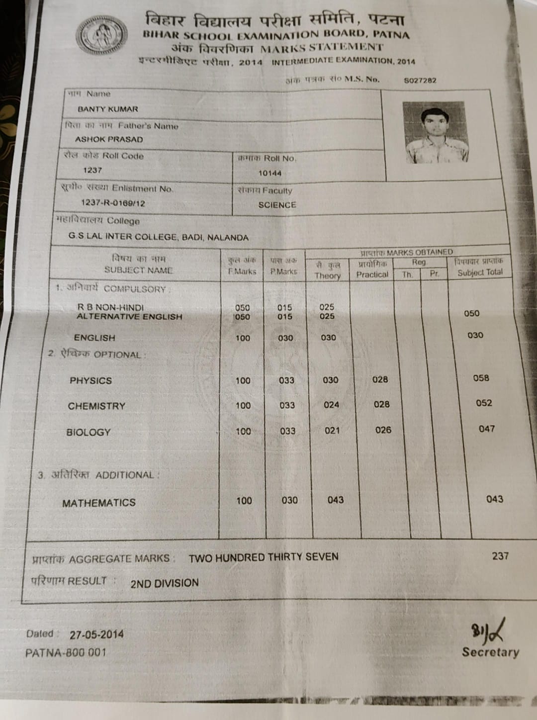 | Exam | Full Marks | Pass Marks | Marks Obtained |
