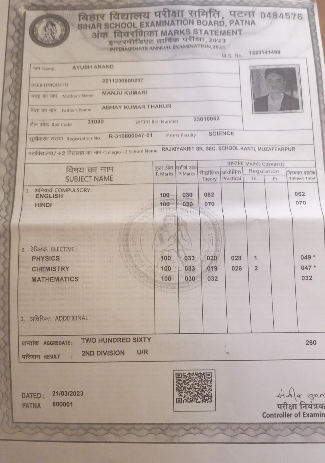 | Exam | Full Marks | Pass Marks | Marks Obtained |