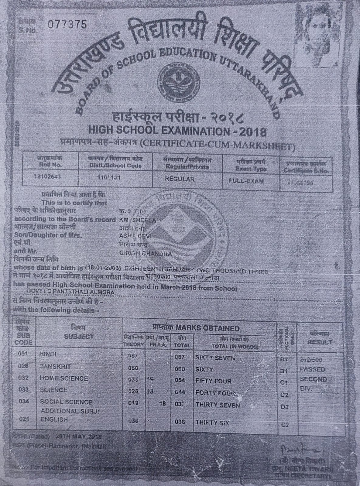 | Exam | Full Marks | Pass Marks | Marks Obtained |