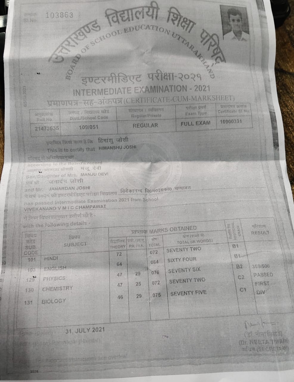 | Exam | Full Marks | Pass Marks | Marks Obtained |
