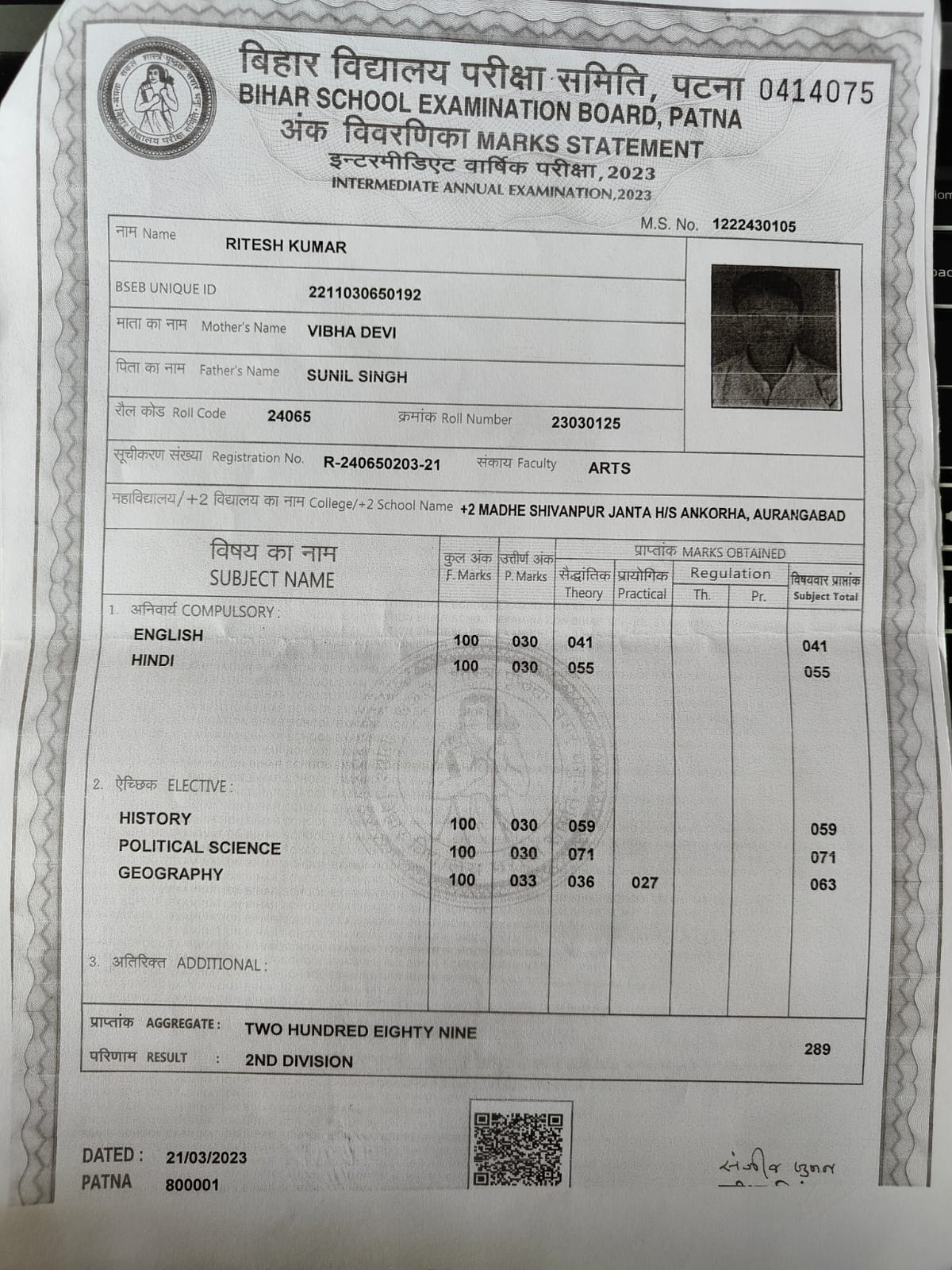 | Exam | Full Marks | Pass Marks | Marks Obtained |