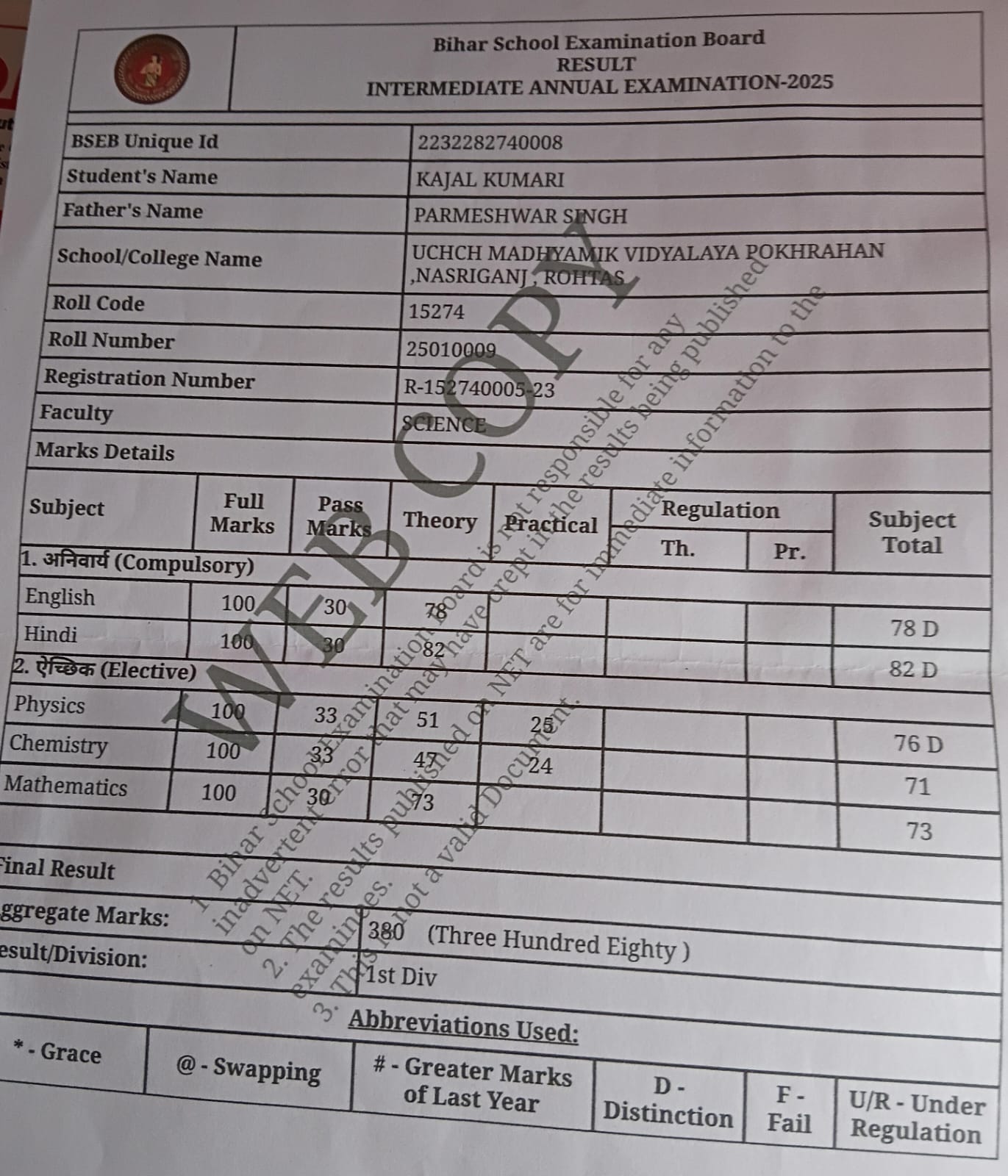 | Exam | Full Marks | Pass Marks | Marks Obtained |