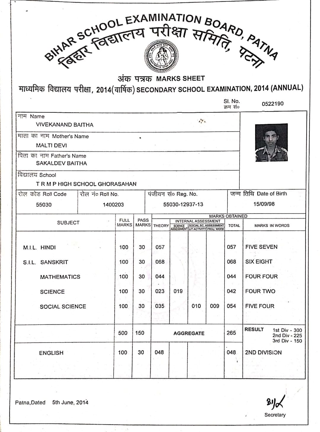 | Exam | Full Marks | Pass Marks | Marks Obtained |