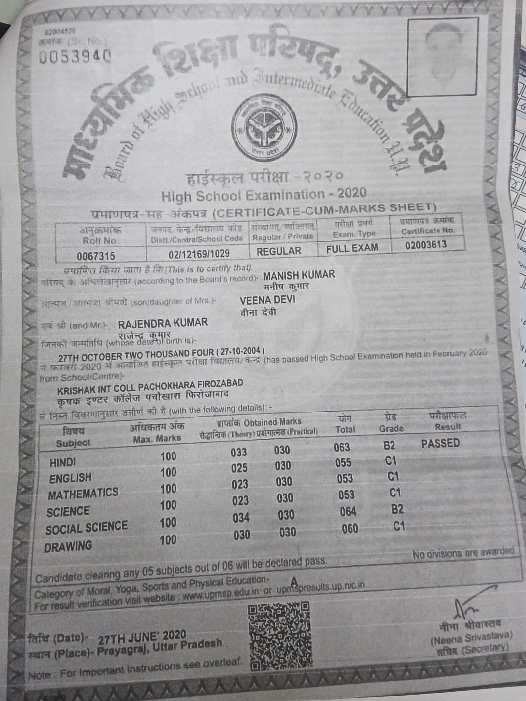 | Exam | Full Marks | Pass Marks | Marks Obtained |