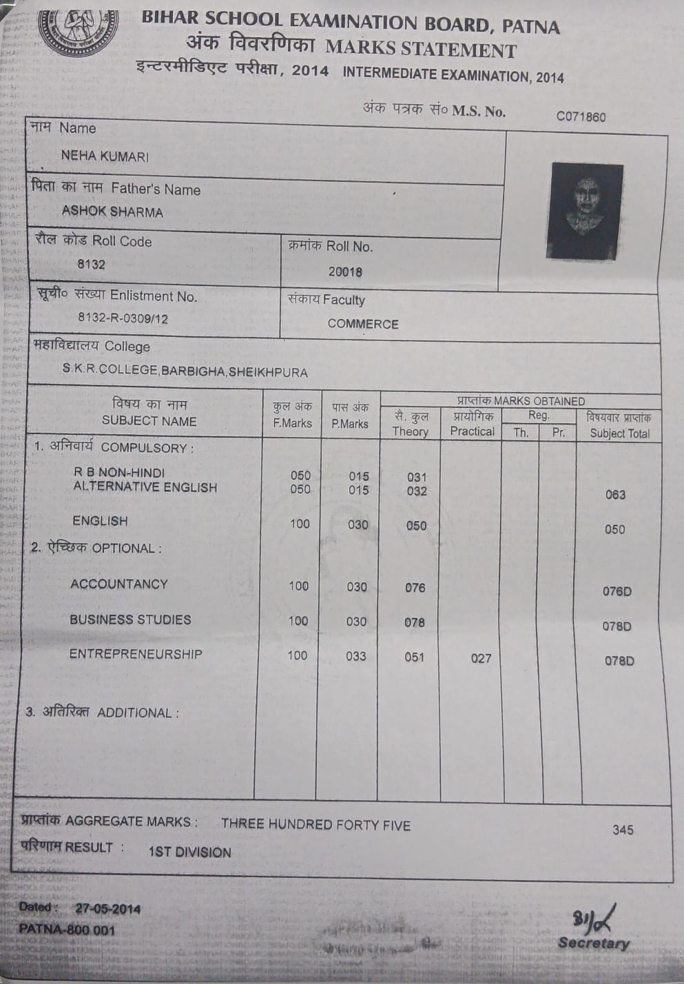 | Exam | Full Marks | Pass Marks | Marks Obtained |