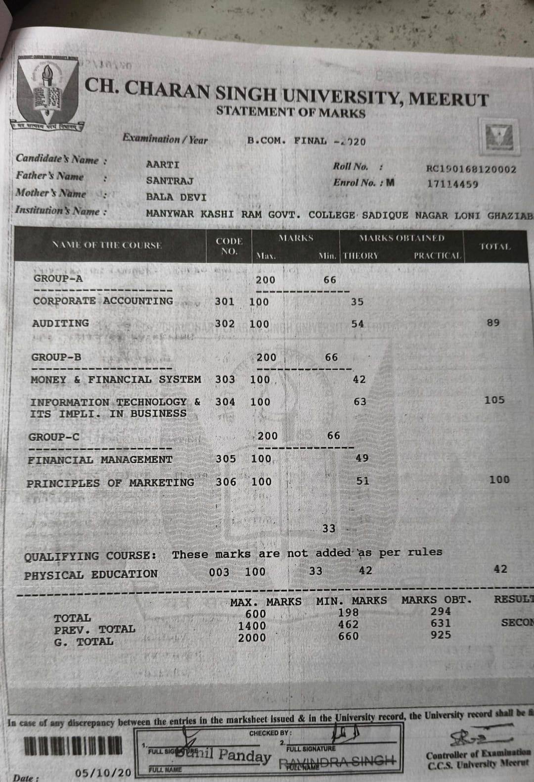 | Exam | Full Marks | Pass Marks | Marks Obtained |