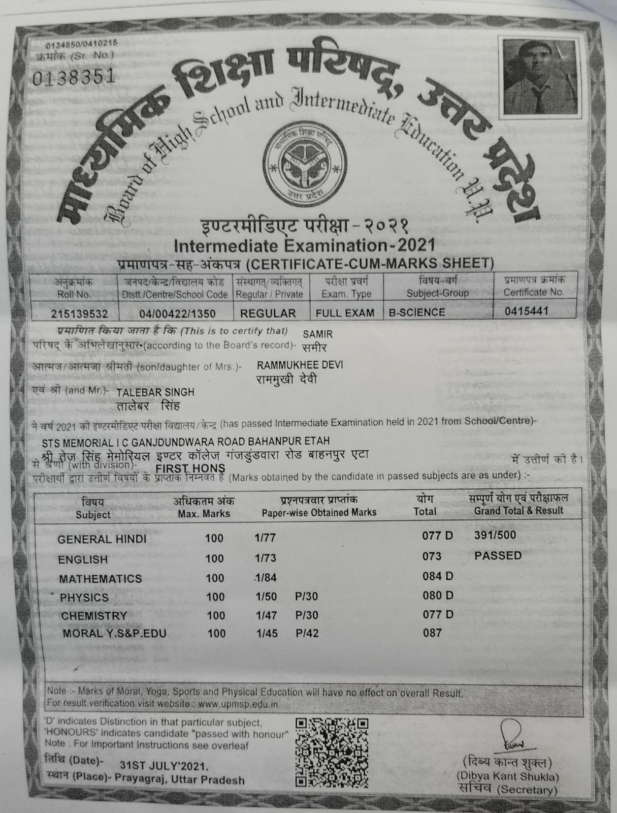 | Exam | Full Marks | Pass Marks | Marks Obtained |