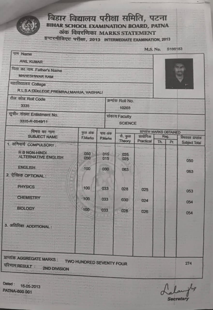 | Exam | Full Marks | Pass Marks | Marks Obtained |