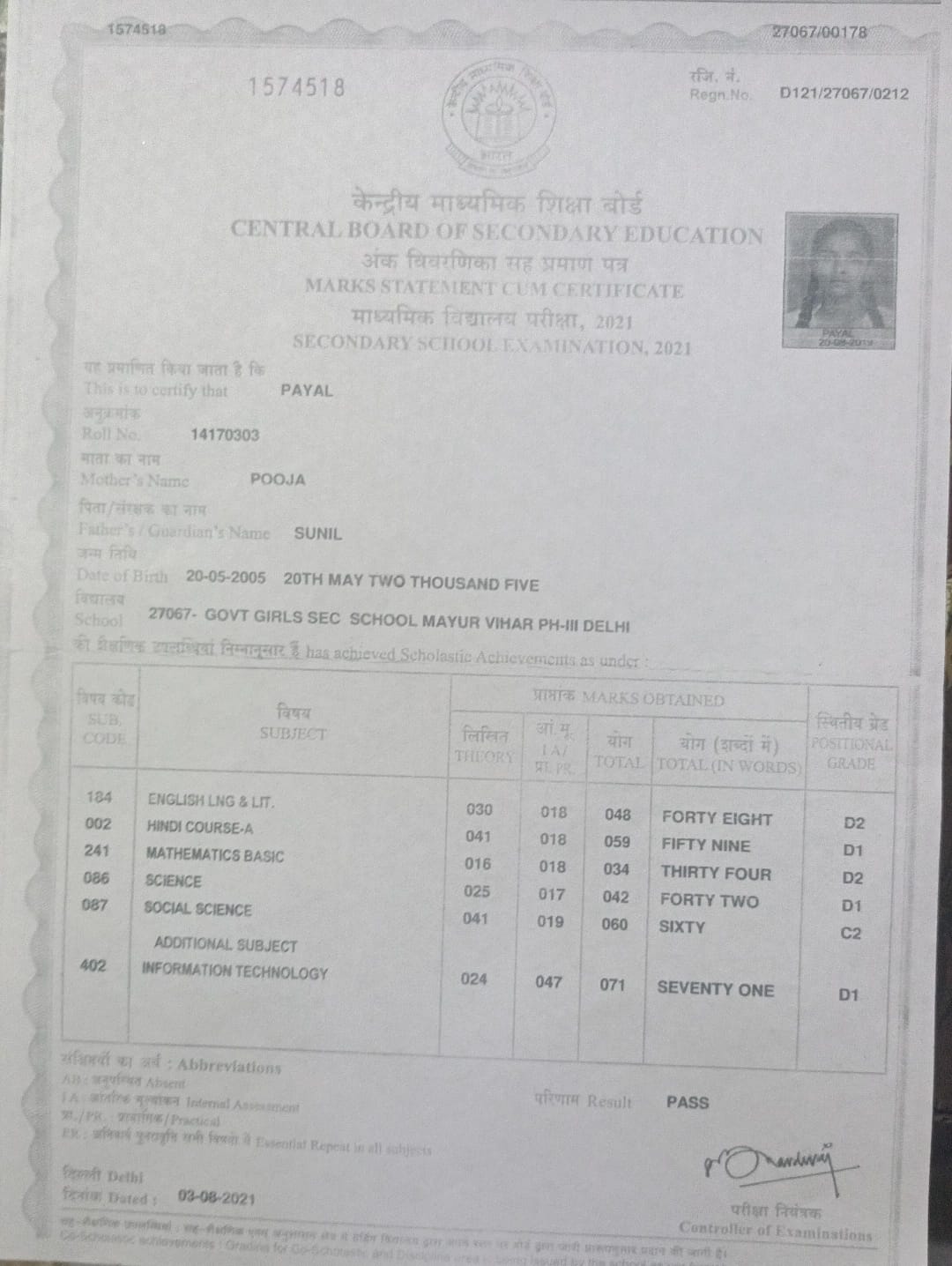 | Exam | Full Marks | Pass Marks | Marks Obtained |