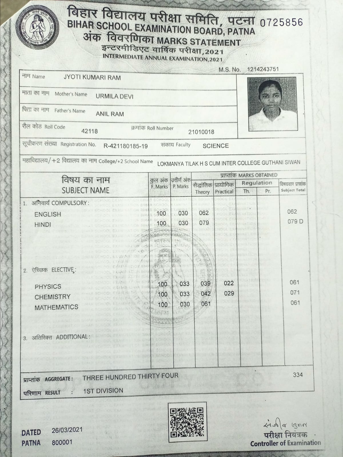 | Exam | Full Marks | Pass Marks | Marks Obtained |