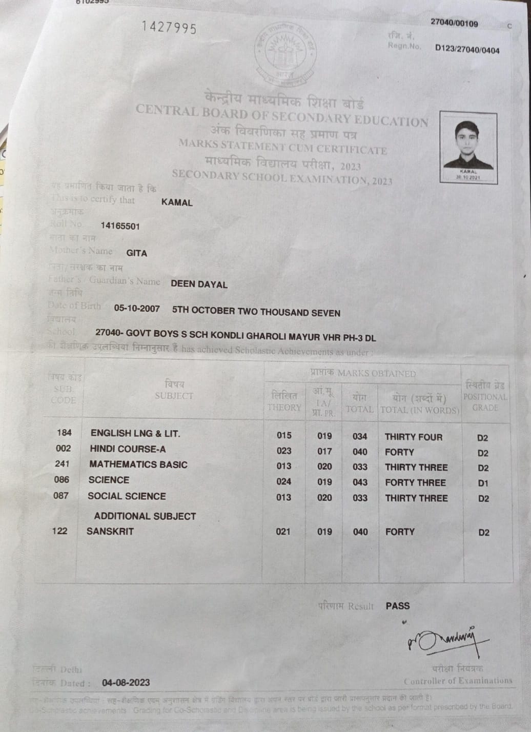 | Exam | Full Marks | Pass Marks | Marks Obtained |