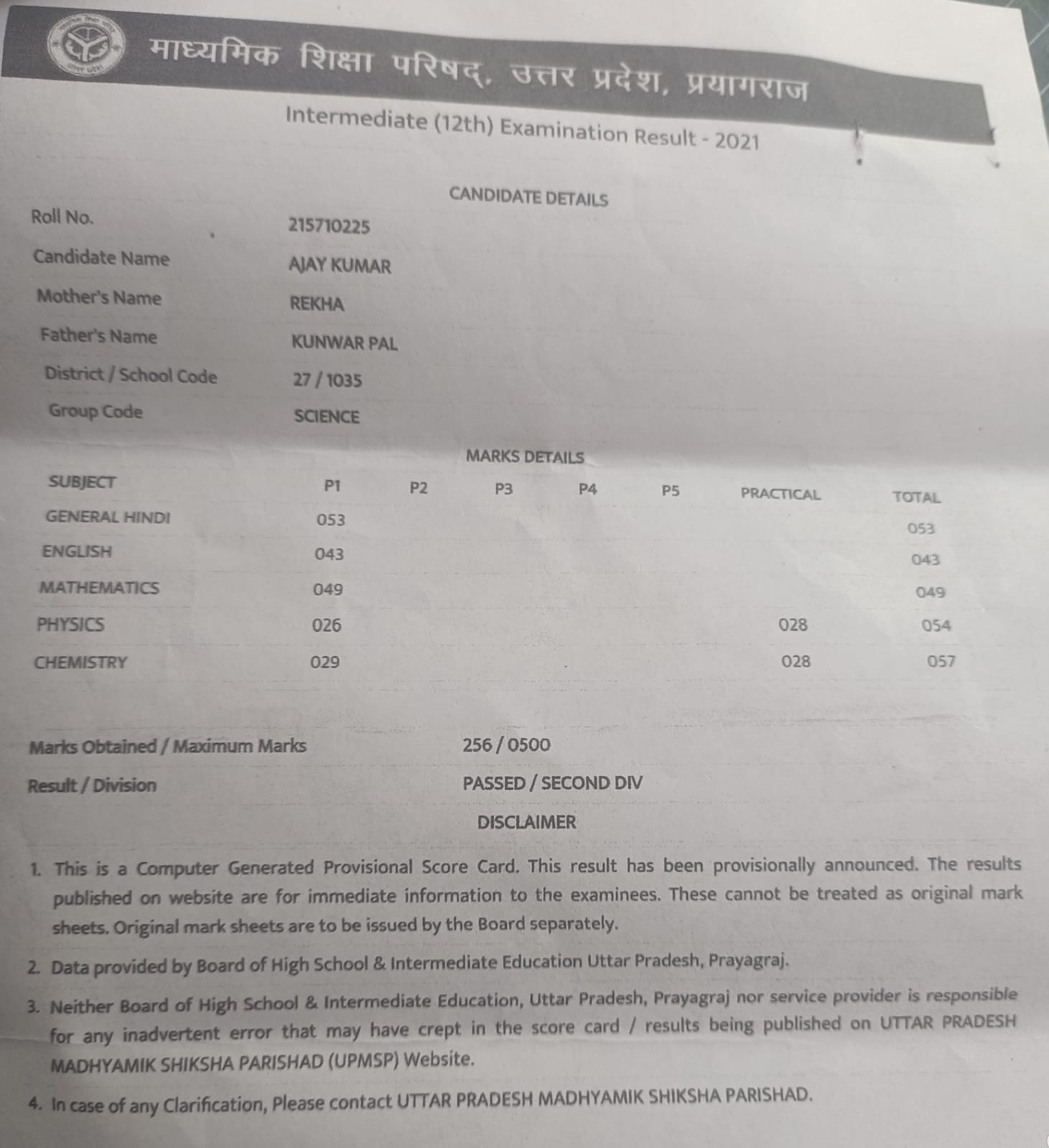 | Exam | Full Marks | Pass Marks | Marks Obtained |