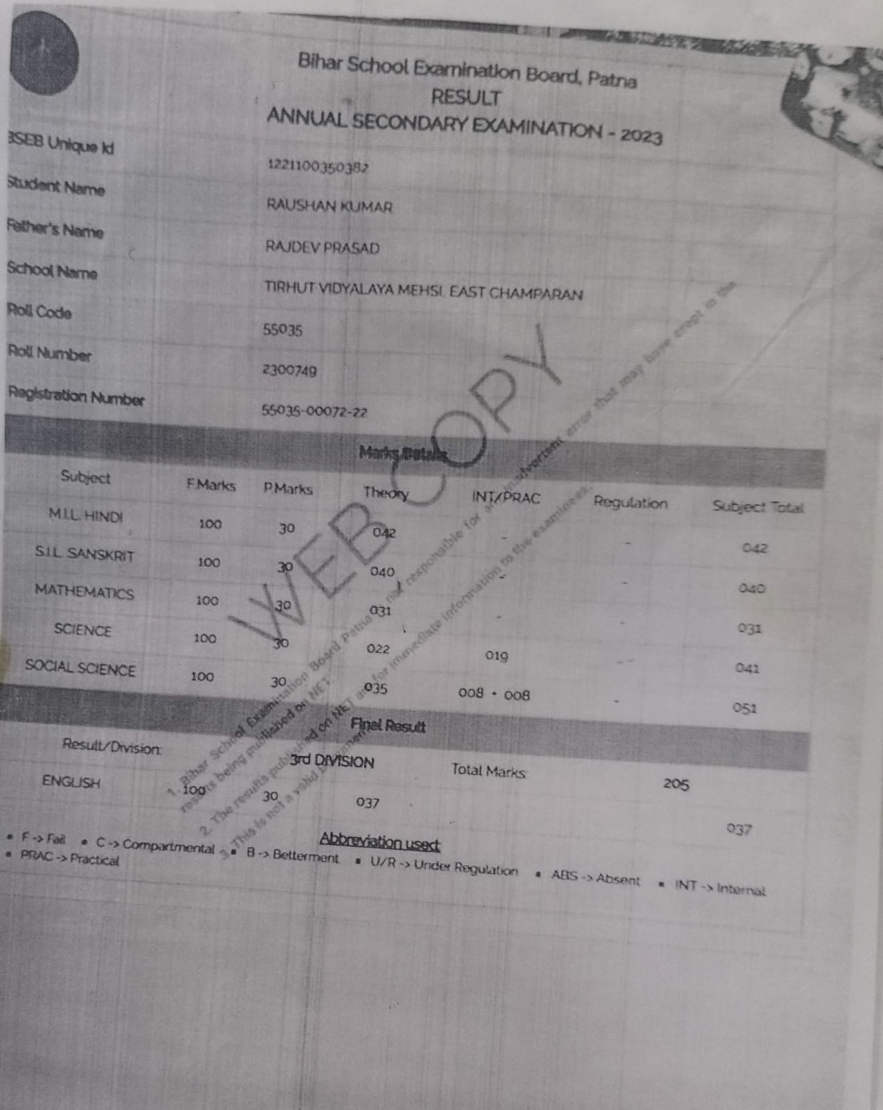 | Exam | Full Marks | Pass Marks | Marks Obtained |