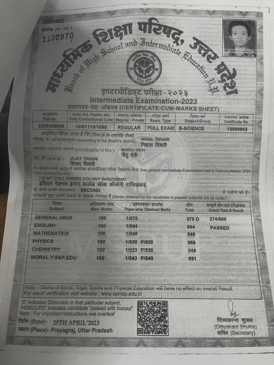 | Exam | Full Marks | Pass Marks | Marks Obtained |