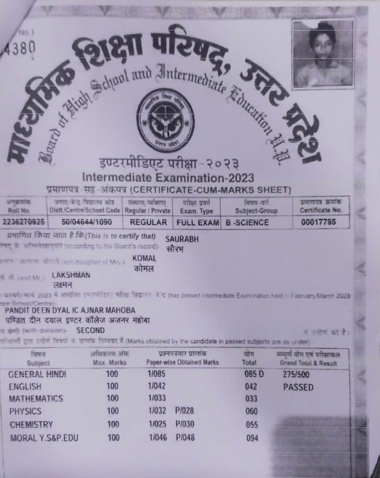 | Exam | Full Marks | Pass Marks | Marks Obtained |