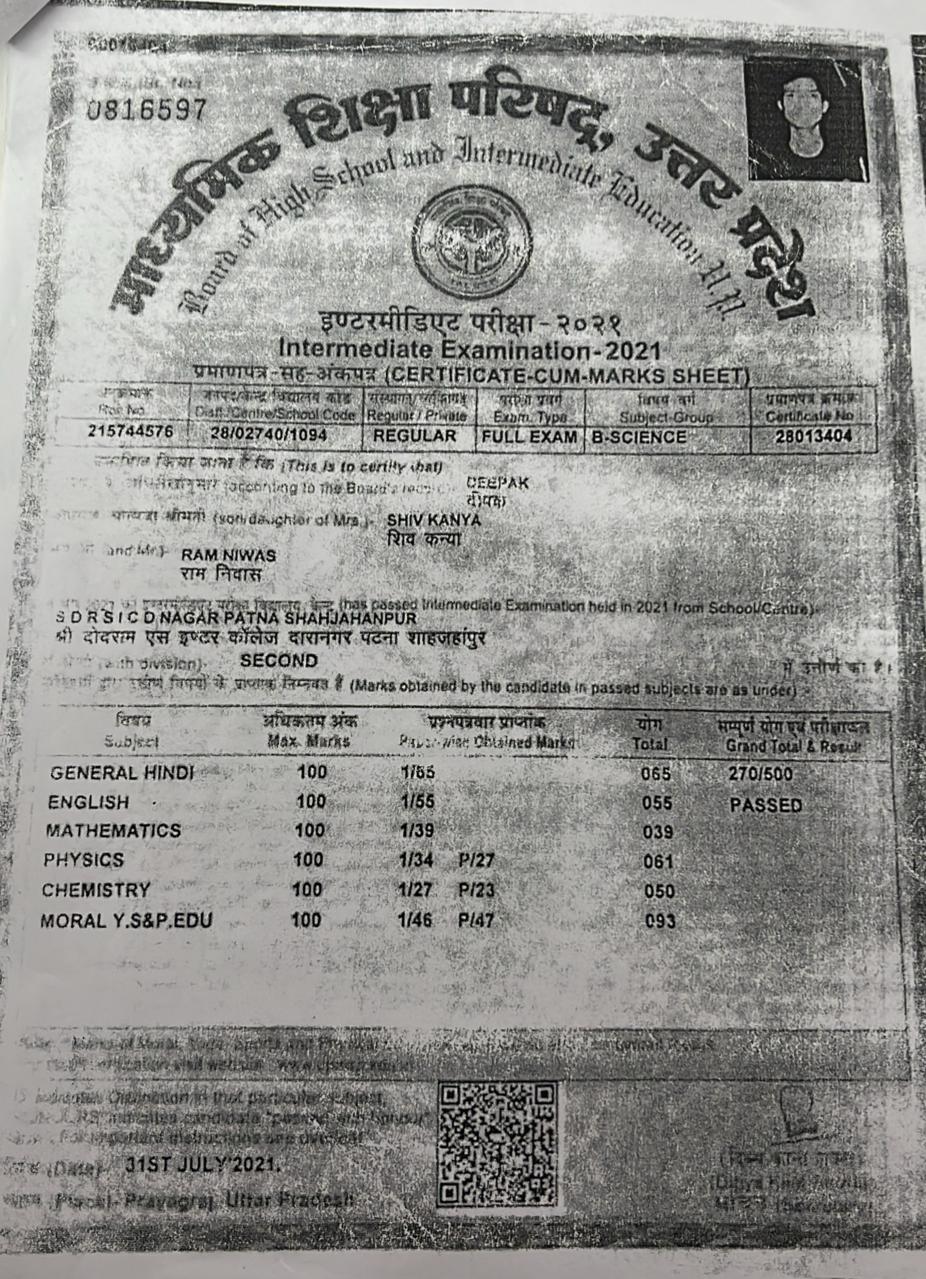 | Exam | Full Marks | Pass Marks | Marks Obtained |