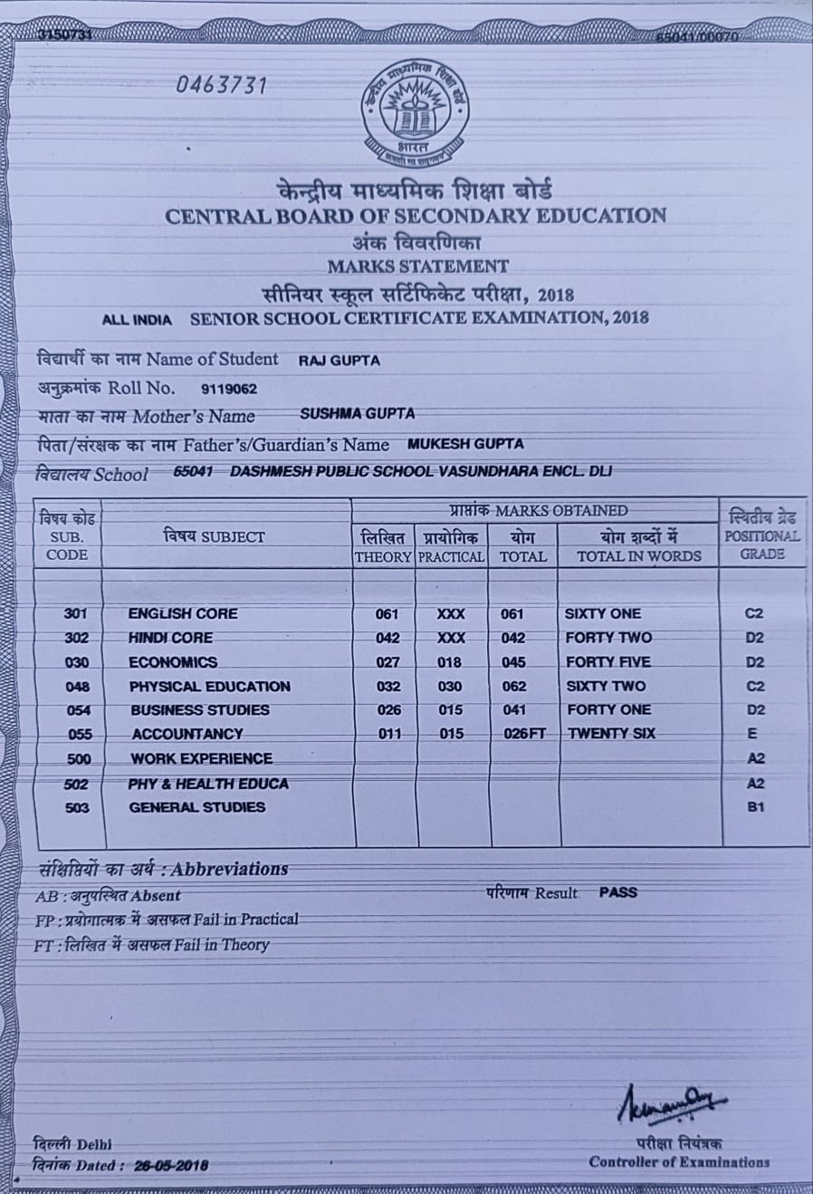 | Exam | Full Marks | Pass Marks | Marks Obtained |