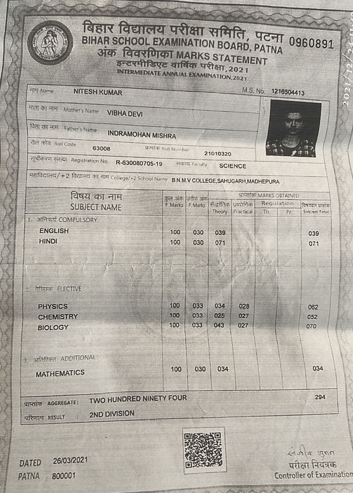 | Exam | Full Marks | Pass Marks | Marks Obtained |