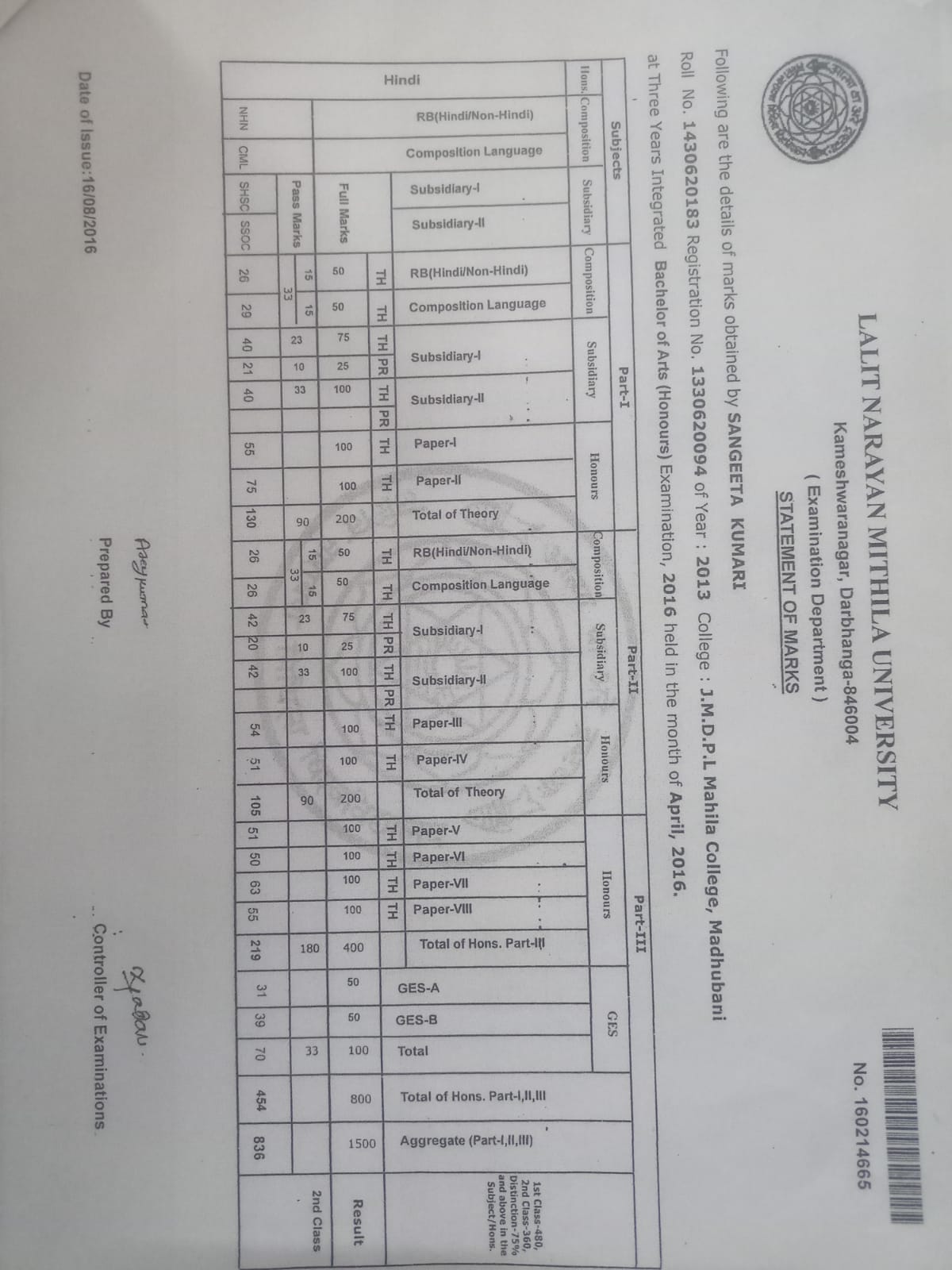 | Exam | Full Marks | Pass Marks | Marks Obtained |