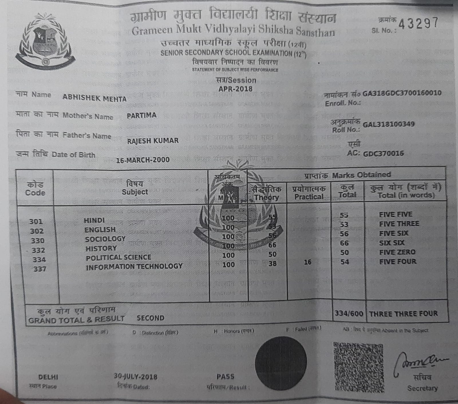 | Exam | Full Marks | Pass Marks | Marks Obtained |
