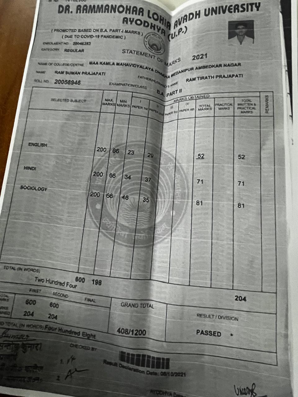 | Exam | Full Marks | Pass Marks | Marks Obtained |