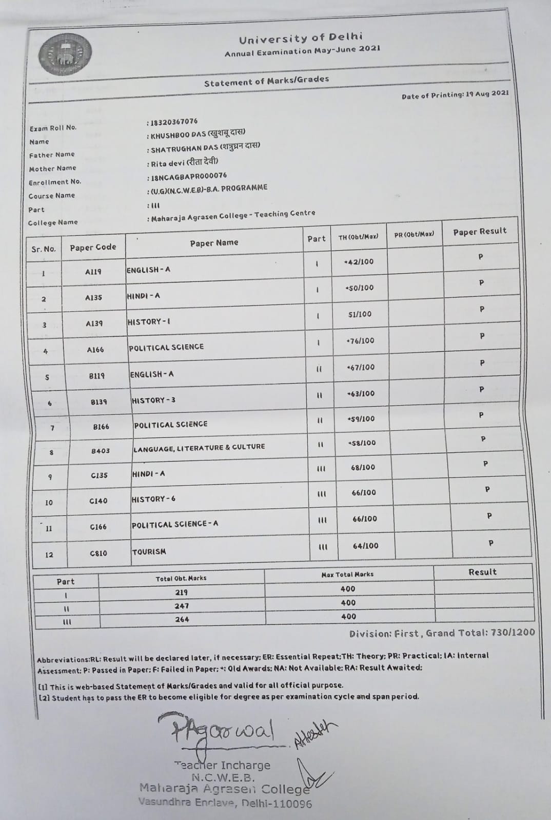 | Exam | Full Marks | Pass Marks | Marks Obtained |