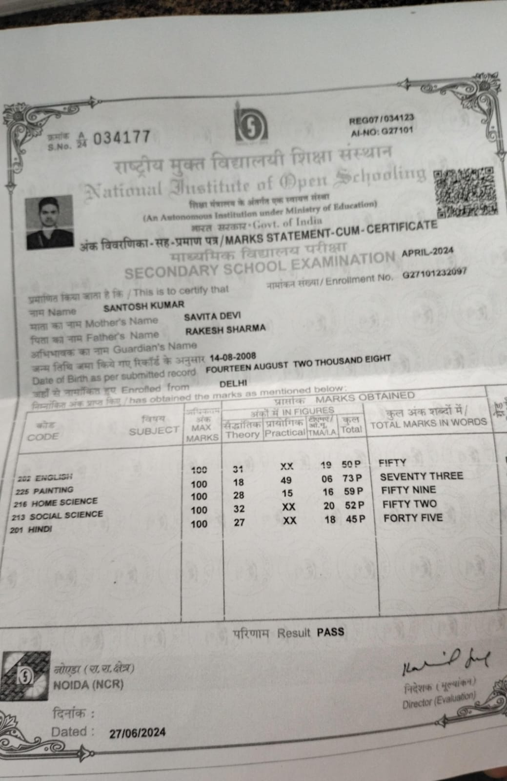 | Exam | Full Marks | Pass Marks | Marks Obtained |